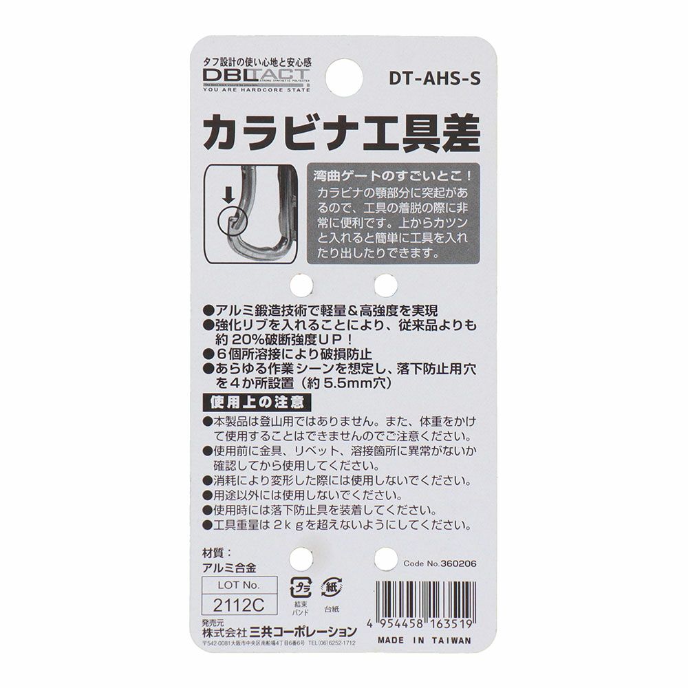 【即納】アルミツールフック(小)シルバー DT-AHS-S カラビナ アルミ 2ツ穴 固定 工具 差 湾曲ゲート ツール 三共コーポレーション 工具ホルダー 工具 作業着 作業服