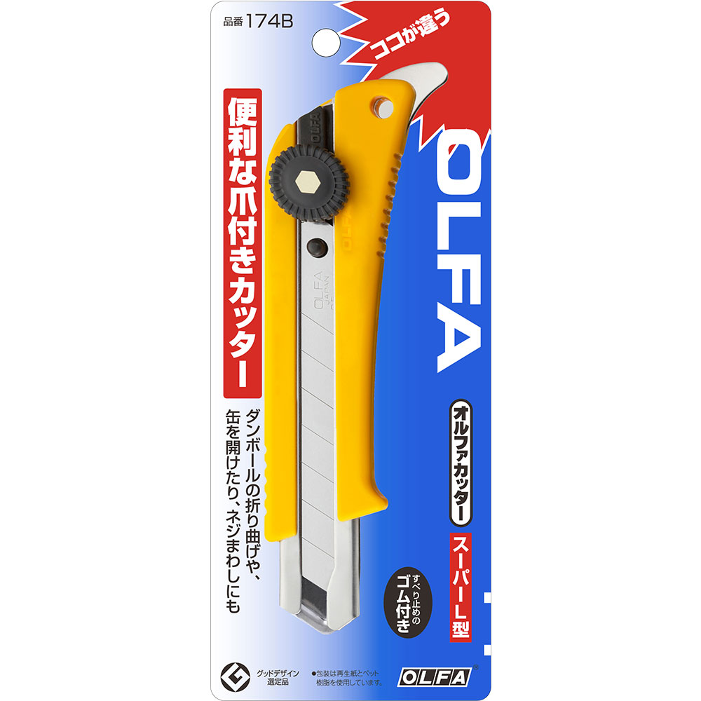 クラフトテープの開封やダンボールの折り曲げ、ペンキ缶などのフタ開けに便利なツメが付いた大型カッターナイフ。