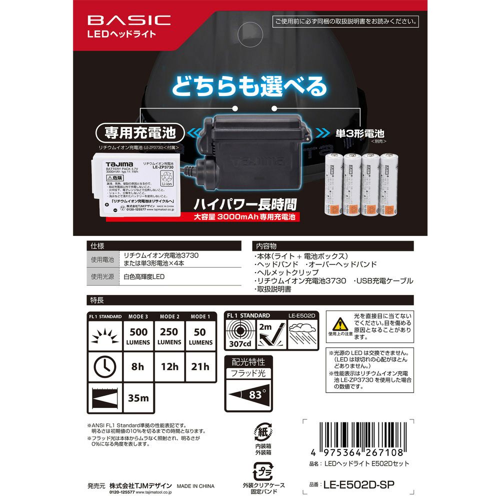 ■製品重量(g) 118g ■仕様 ・外形寸法(ランプ部):H38 × W87 × D54mm ・使用電池:リチウムイオン充電池LE-ZP3730または単3形電池×4本 ・光学系:凸レンズ ・使用光源:白色高輝度LED ・明るさ(全光束):最大500lm ・連続使用時間:モード1 50lm:21h、モード2 250lm:12h、モード3 500lm:8h ・照射距離:35m ・防水仕様:IPX4 防水(防沫型)/ 落下強度:2m ・米国規格 ANSI/NEMA FL1-2009に準拠した性能および信頼性試験で得た結果を基に性能表記をしております。 ・製品の性能表示は専用リチウムイオン充電池 LE-ZP3730を使用した場合の数値であり、単3形電池を使用した場合は表記の性能と異なる場合があります。詳しい性能表示・条件については取扱説明書をご確認ください。 ■材質 本体:ABS、PC、PA6 電池BOX:ABS、PA+GF ヘッドバンド:縫製ゴム ヘルメットクリップ:PP バッテリー:ABS、リチウムポリマーセル ■付属品 ヘッドバンド・ヘルメットクリップ×4個・オーバーヘッドバンド・リチウムイオン充電池3730・USB充電用マイクロBケーブル ■ご注意 モニターの発色の具合によって実際のものと色が異なる場合があります。 仕様が予告なく変更される場合があります。